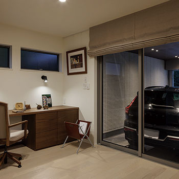 書斎はガレージの隣に配置され、愛車を眺められる特別な空間に。