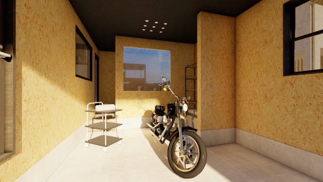 車やバイク、DIY、キャンプなど多彩な趣味を持つオーナーが、車2台・バイク1台が入る「遊び場」として設計した実例です。