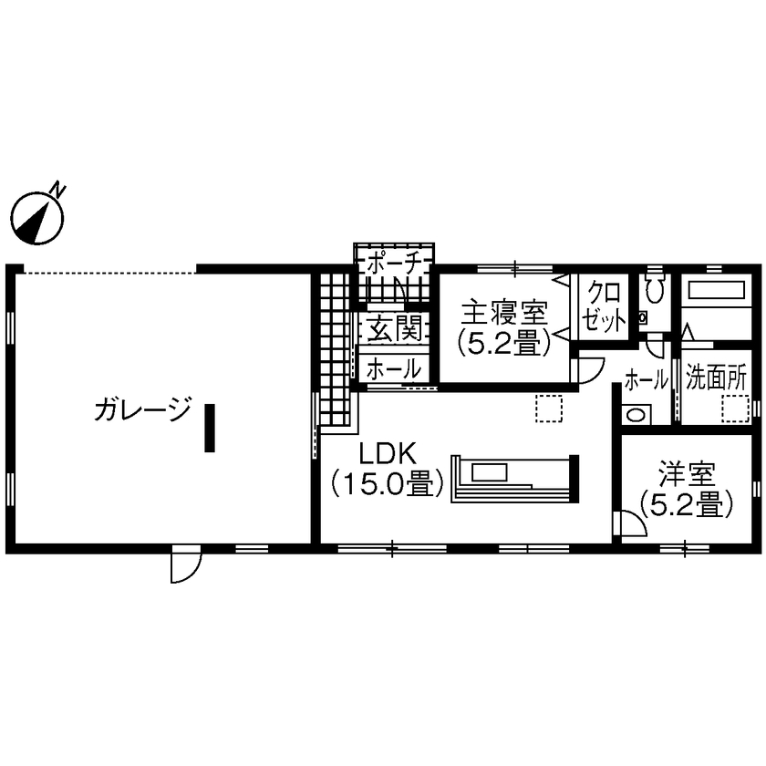 キッチン・水まわりは最小限に抑え、ガレージとLDKに広さを確保しています。